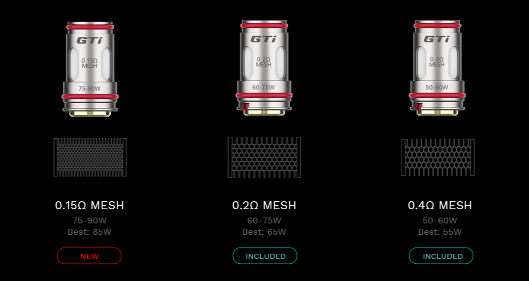 • Coil range: gti 0.15 (75-90W), 0.2 (60-75W), 0.4 (50-60W)